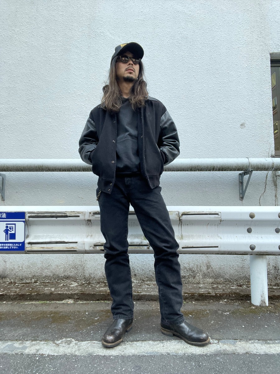 定番のスタジャンですが、オールブラックになるだけで印象はぐっと大人びます。